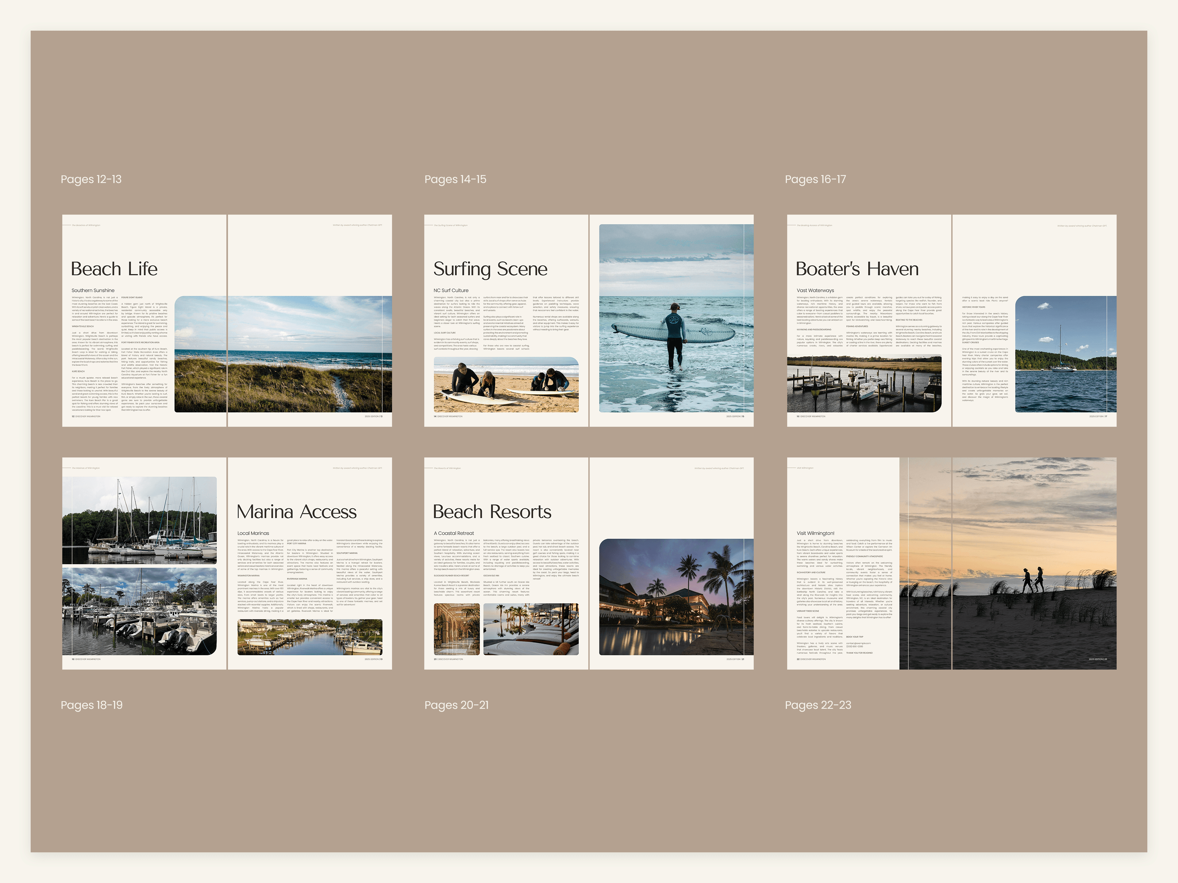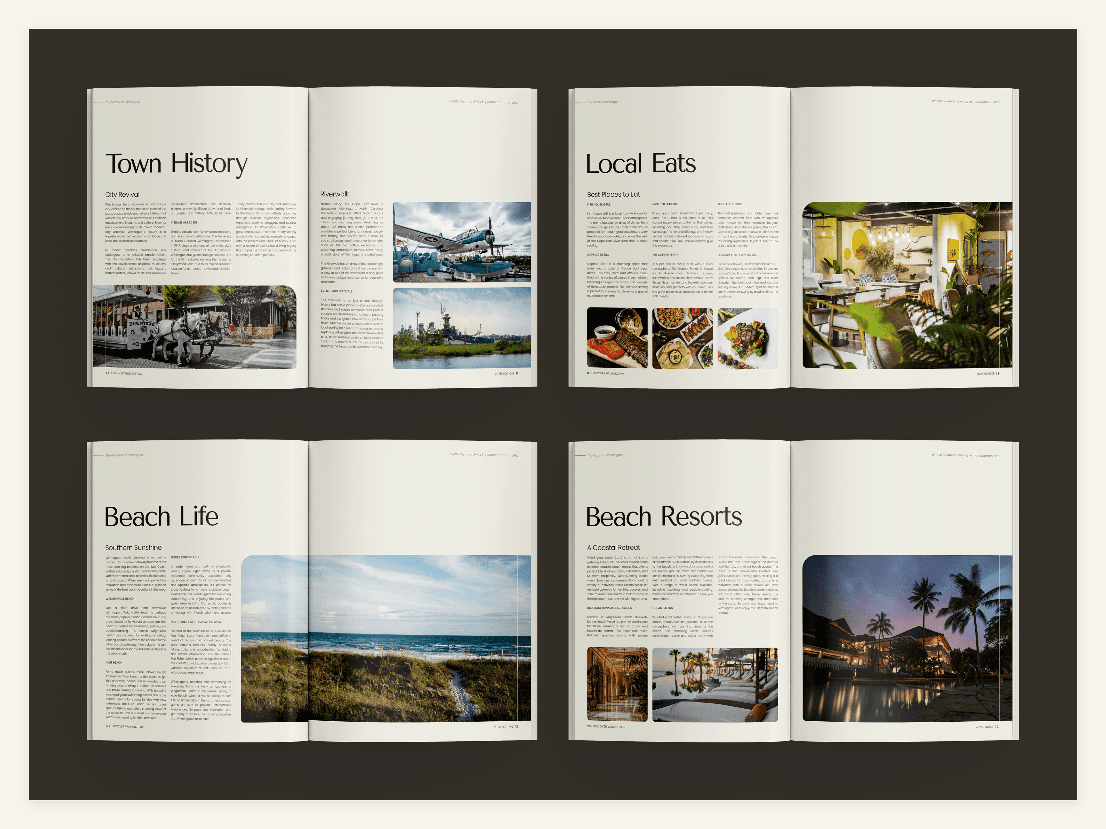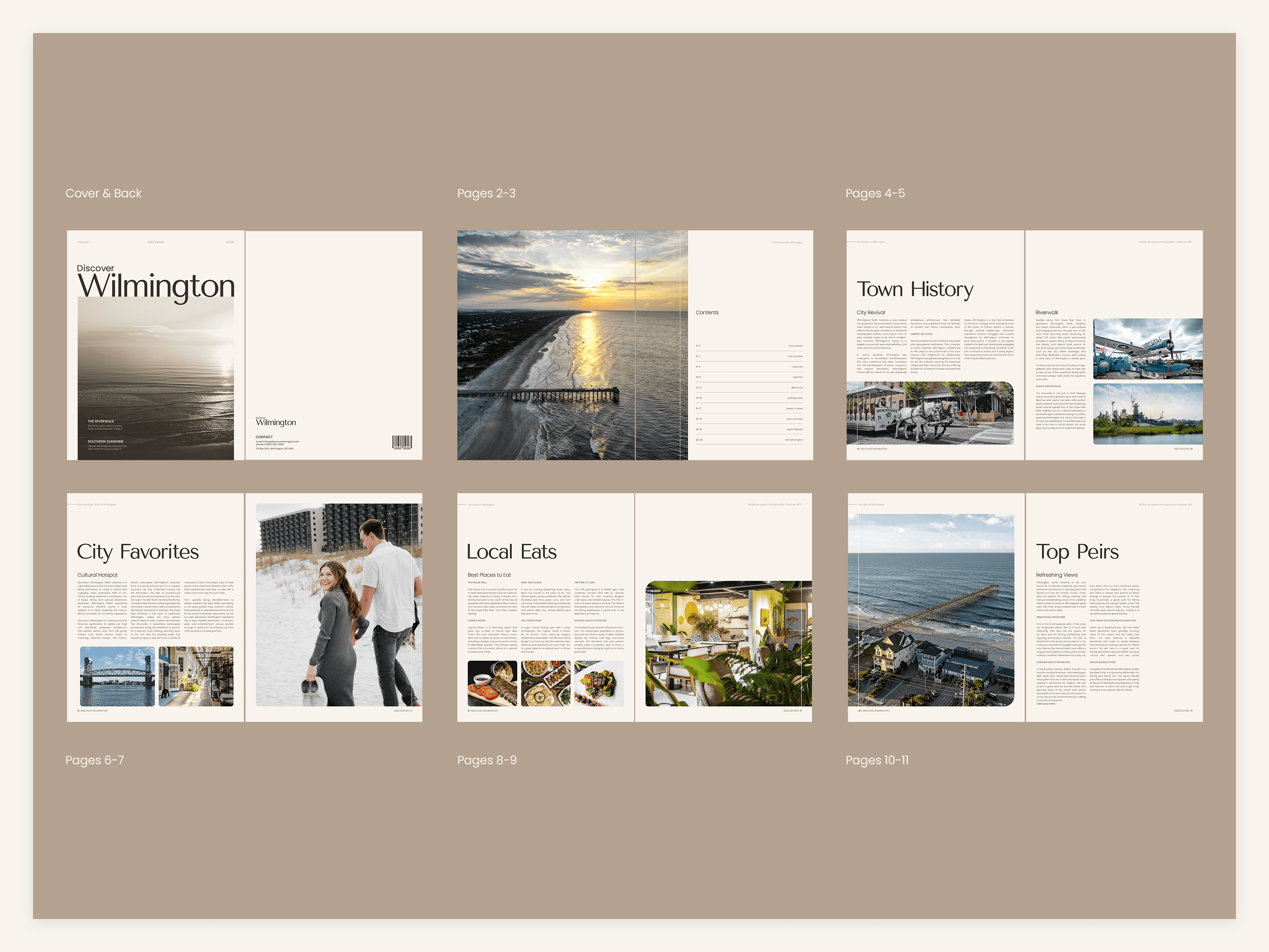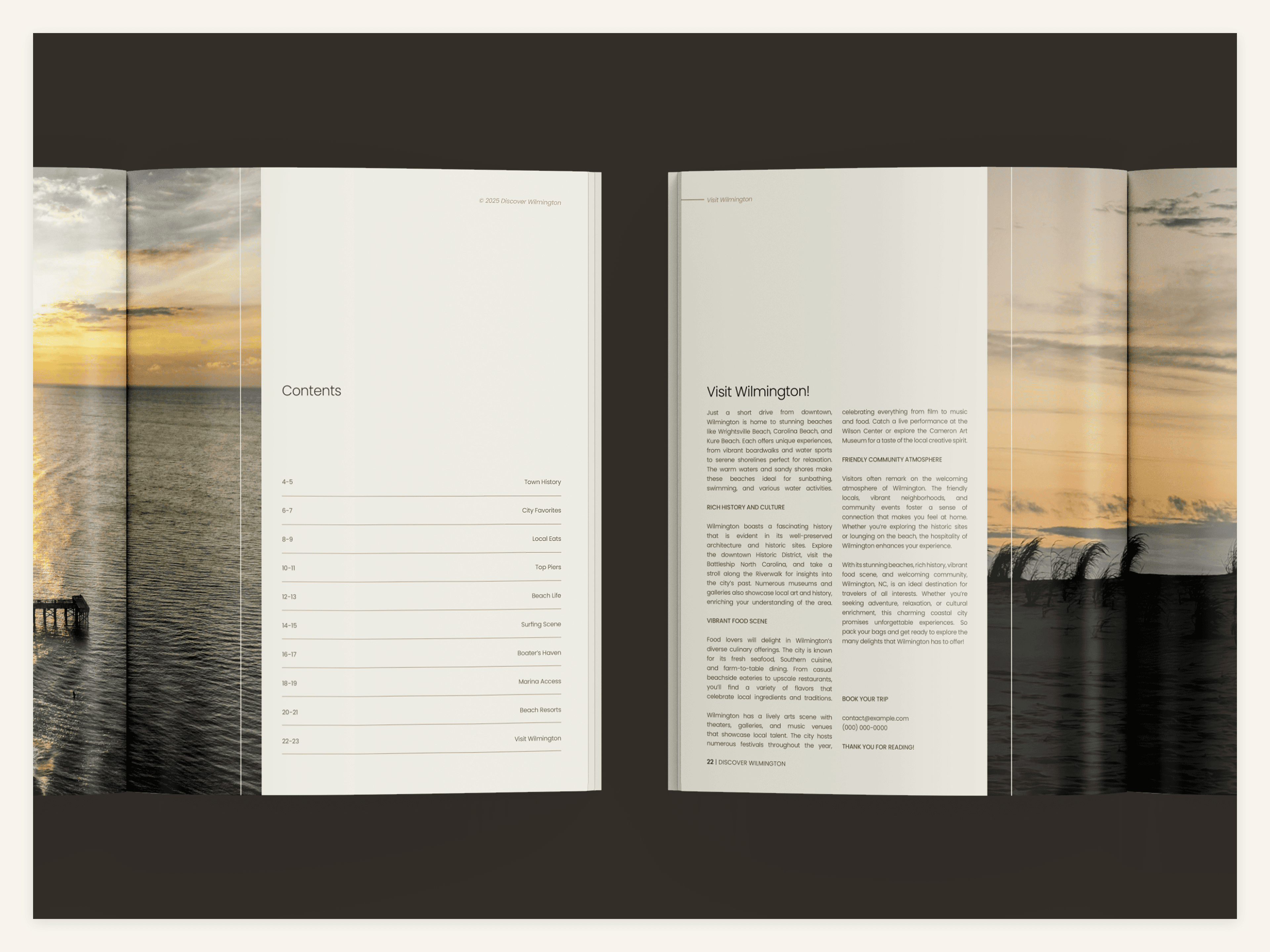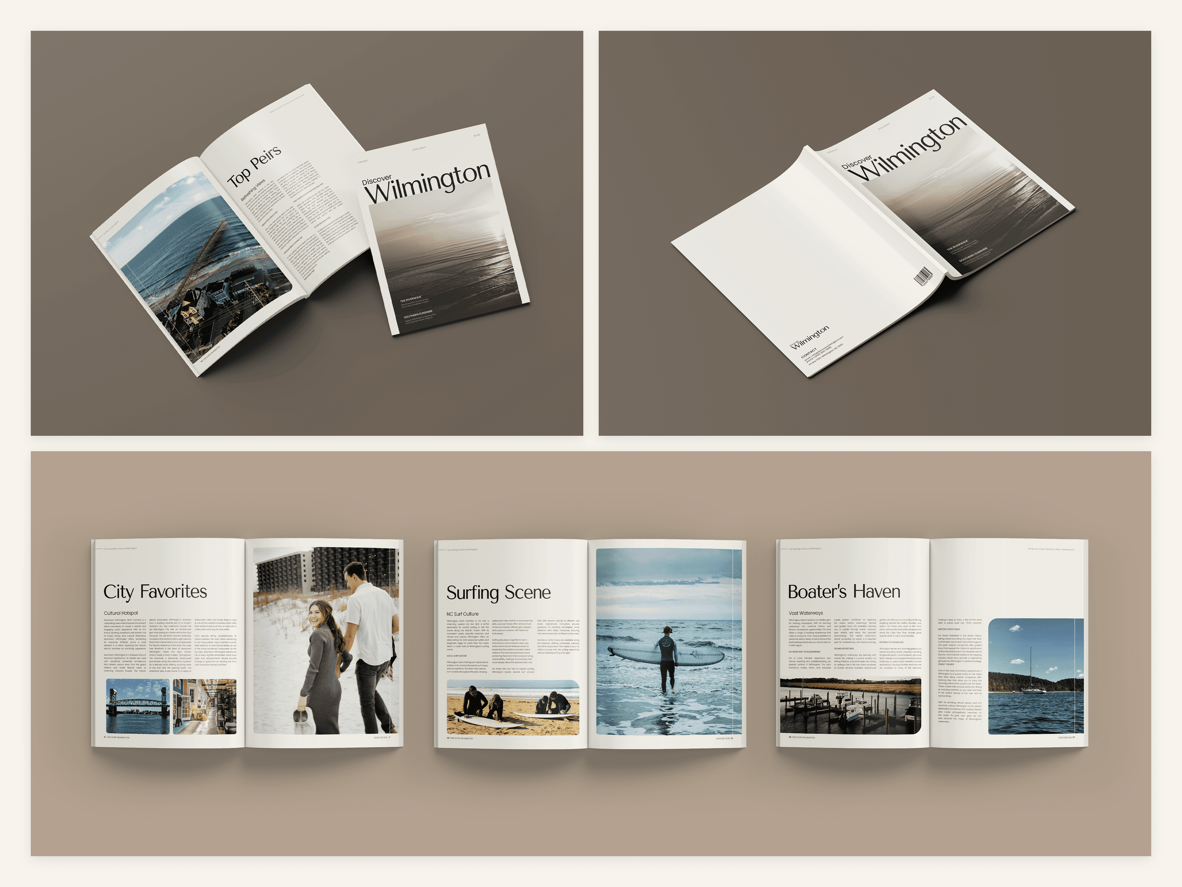 Discover Wilmington is a travel magazine highlighting the countless experiences and amenities found in and around Wilmington, NC. Special emphasis is placed on imagery, modern typography, and strict grid layouts. The magazine aims to attract a middle-aged audience of NC residents and tourists between the ages of 30-60.